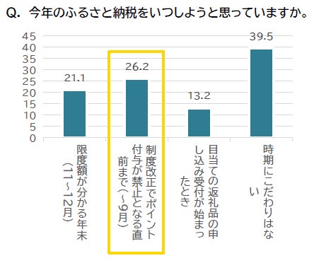 寄附時期は「こだわりがない」に続き「制度改正の直前」が多く、9月までの寄附を検討する人が多くなることが推測できる。