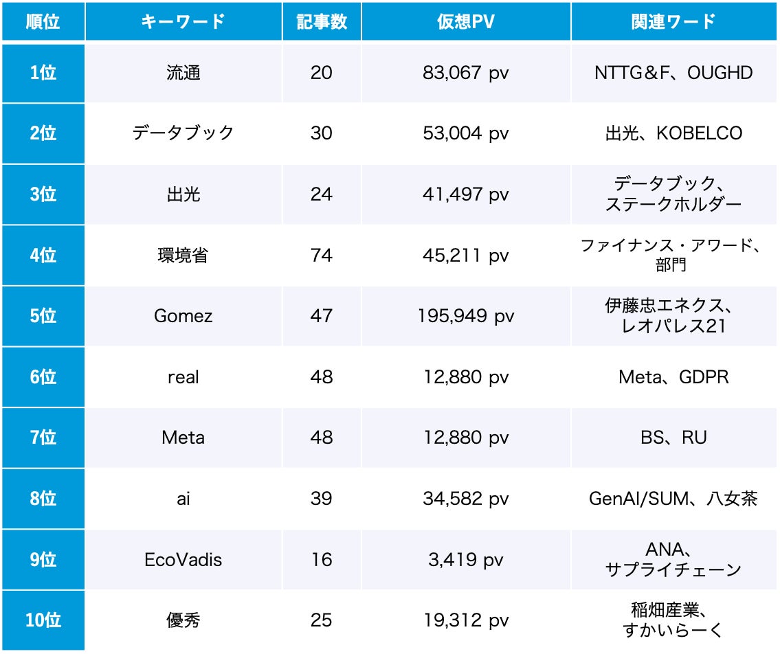 5位と10位は「Gomez ESGサイトランキング2025」発表を受けての話題。株式会社ブロードバンドセキュリティが上場企業のIRサイトを「ウェブサイトの使いやすさ」「ESG共通」「E(環境)」「S(社会)」「G(ガバナンス)」の観点で評価したものです。