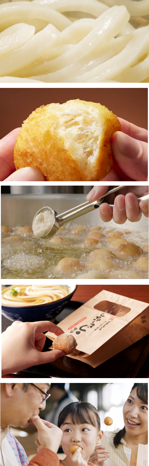 お店でうどんをミキサーにかけてペースト状に。数時間おきにひく白だしを生地に加えるのが丸亀製麺ならではのこだわり。旨みと香り高い風味をプラスします。もっちもち食感を生みだすために空気を含ませながらやさしく粉と混ぜ合わせ、生地を少し寝かせます。丸い形に整えて、ひとつずつ丁寧に揚げたらできあがり。手づくりならではの素朴なおいしさをお楽しみください。