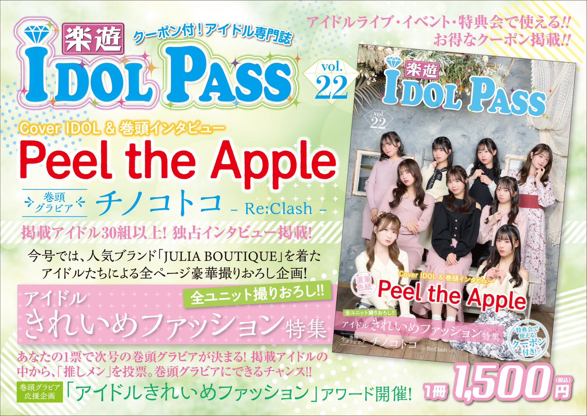 物販で使えるアイドルクーポン満載!Peel the Apple表紙の楽遊IDOL PASS vol.22がタワーレコード・HMV・楽遊通販等で発売開始!