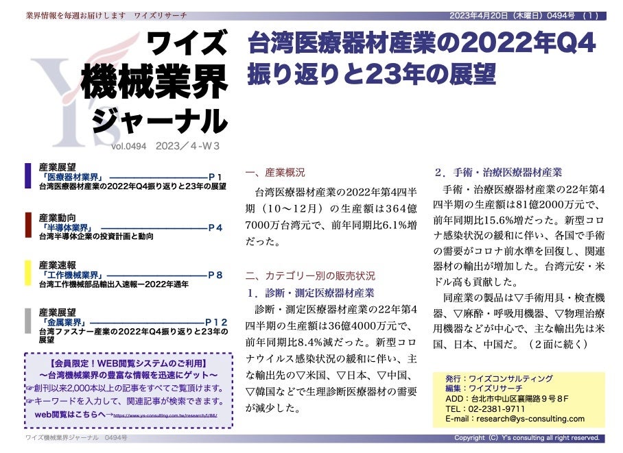 台湾医療器材産業の2022年Q4振り返りと23年の展望<ワイズ機械業界ジャーナル2023年4月第3週号発行>
