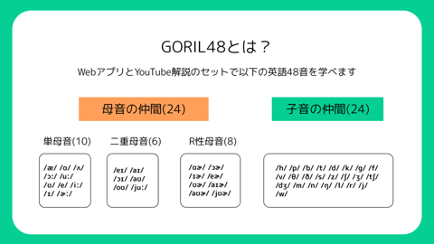 「GORIL」は、語+ドリルから名付けられた、どんな人でも、楽しく使える全く新しいタイプの発音学習ツールです。音声を科学的に分析し、可視化して、再現可能な一種の運動とすることで、楽しく発音を身に着けることができるツールです。