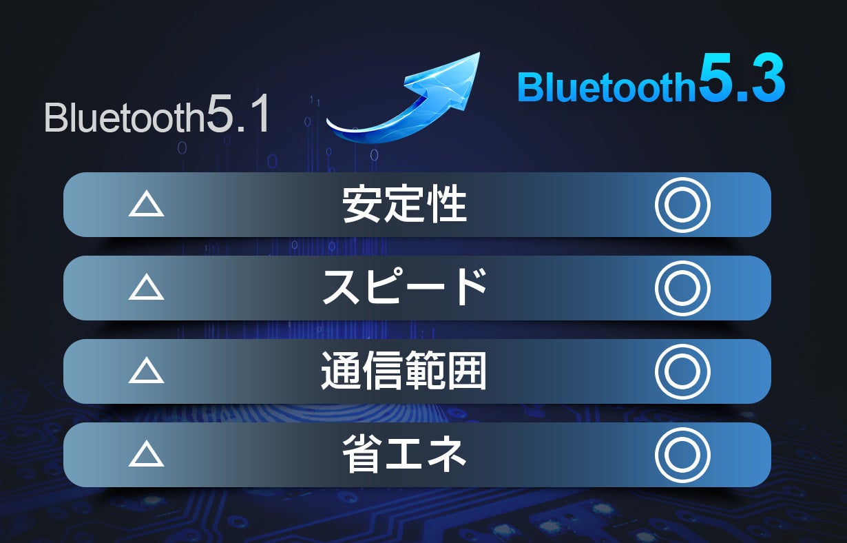 高性能なBluetooth5.3チップを搭載し、通信範囲と転送速度が大幅に改良され、街中や電車、駅内などでもスマホとの連動が更にスームズに。接続もより安定になります。