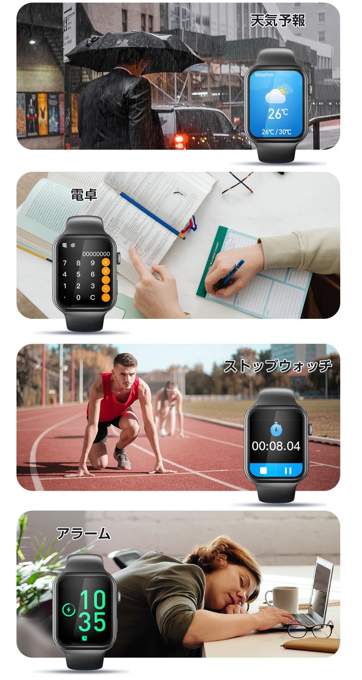 また、専用アプリとの連携で、多種類スポーツモードと運動時の心拍数*、歩数などの計測・記録をすることもできます。「itDealスマートウォッチ」は生活管理及び運動管理の大切なパートナーとなってくれる新世代のスマートウォッチです。