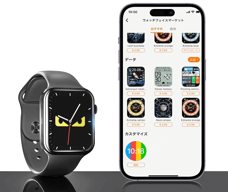 スマートウォッチ本体に10つの文字盤が搭载しています。それ以外にアプリから100種類以上の文字盤をダウンロードできます。