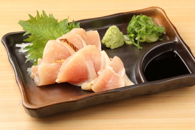 安全と品質にこだわったコクのある鶏お刺身の旨味を、とろりとまろやかな九州の甘口醤油と爽やかなワサビの風味が引き立てる人気の一品です。