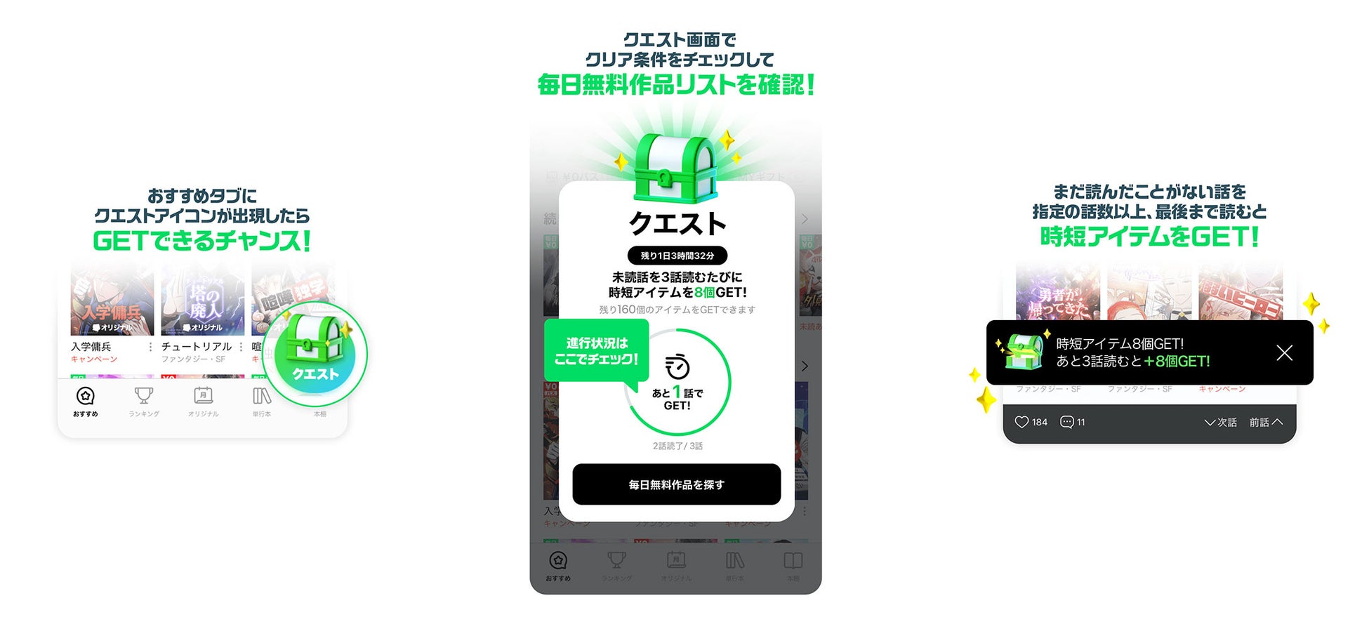 クエスト画面で毎日無料作品リストを確認し、まだ読んだことがない話を指定の話数以上、最後まで読むと「時短アイテム」をGETすることができます。