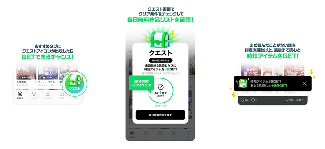 「LINEマンガ」アプリのおすすめタブにクエストアイコンが出現し、クリア条件を達成することで手に入れることができます。