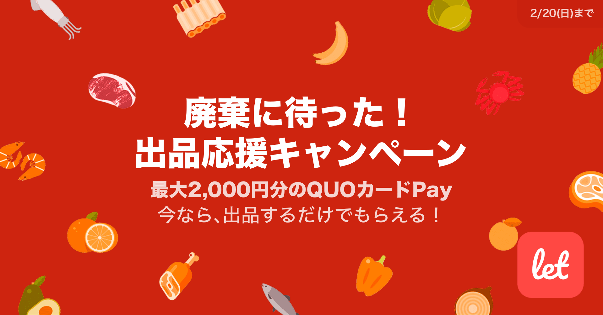 株式会社レット(本社:東京都港区、代表:佐藤 航陽)が運営する、食品ロス/在庫ロス削減のマーケット「Let(レット)」内で「廃棄に待った! 出品応援キャンペーン」を2月15日(火) 正午より開催します。はじめて「食品」を出品した方を対象に最大2,000円分のQUOカードPayをプレゼントいたします。レットでは最短1分で簡単に商品の販売が可能で、獲得ポイントはアプリ内の商品購入にご利用いただけますので、ご自身で生産されているお野菜や果物などの販売にこの機会を是非ご利用ください。