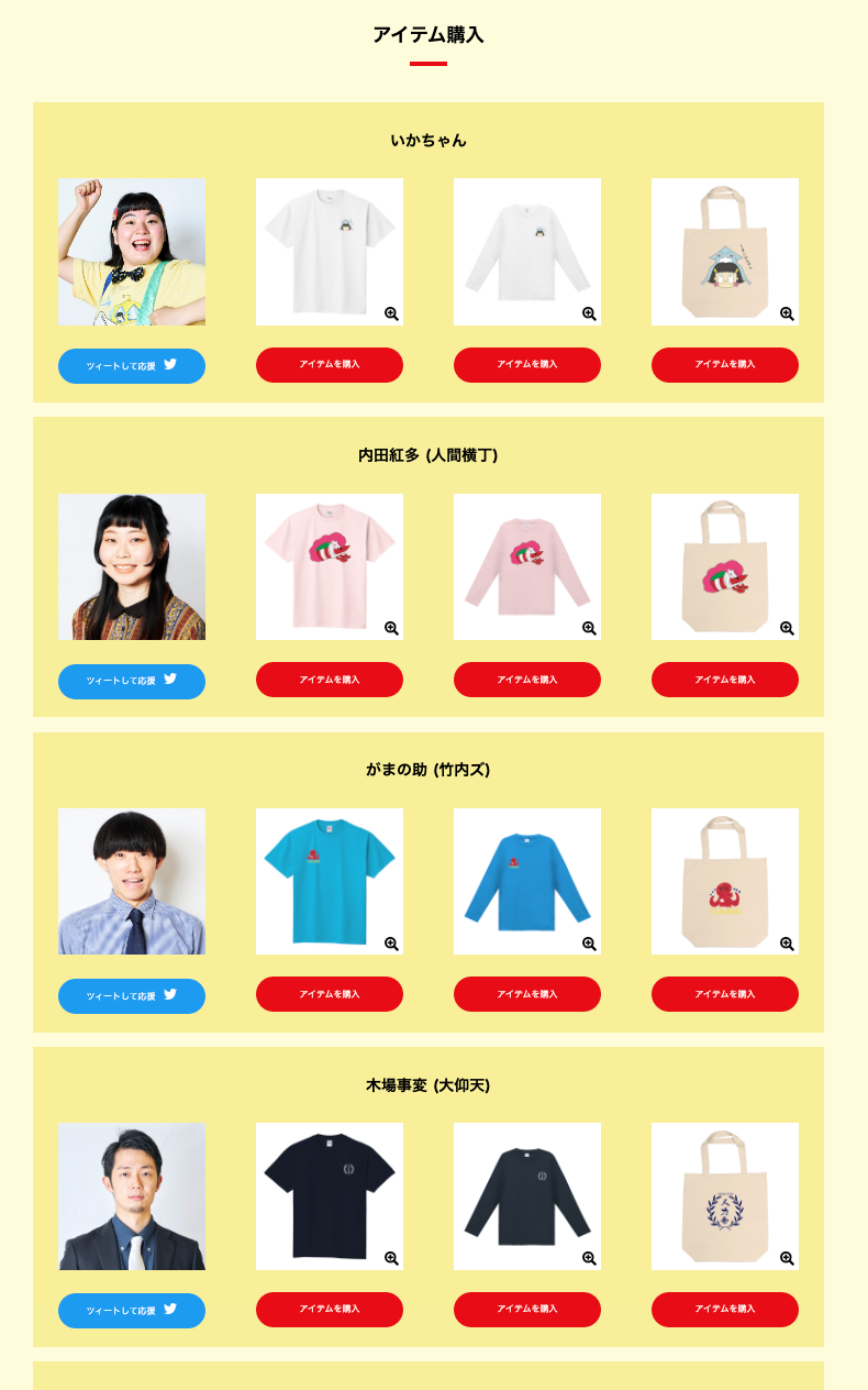 お笑い芸人総勢18名がコラボのためにオリジナルのグッズを自らデザインし販売枚数を競いガチンコバトル! アイテムの購入や応援ツイートで応援してあなたの推しの芸人をグランプリに輝かせよう!