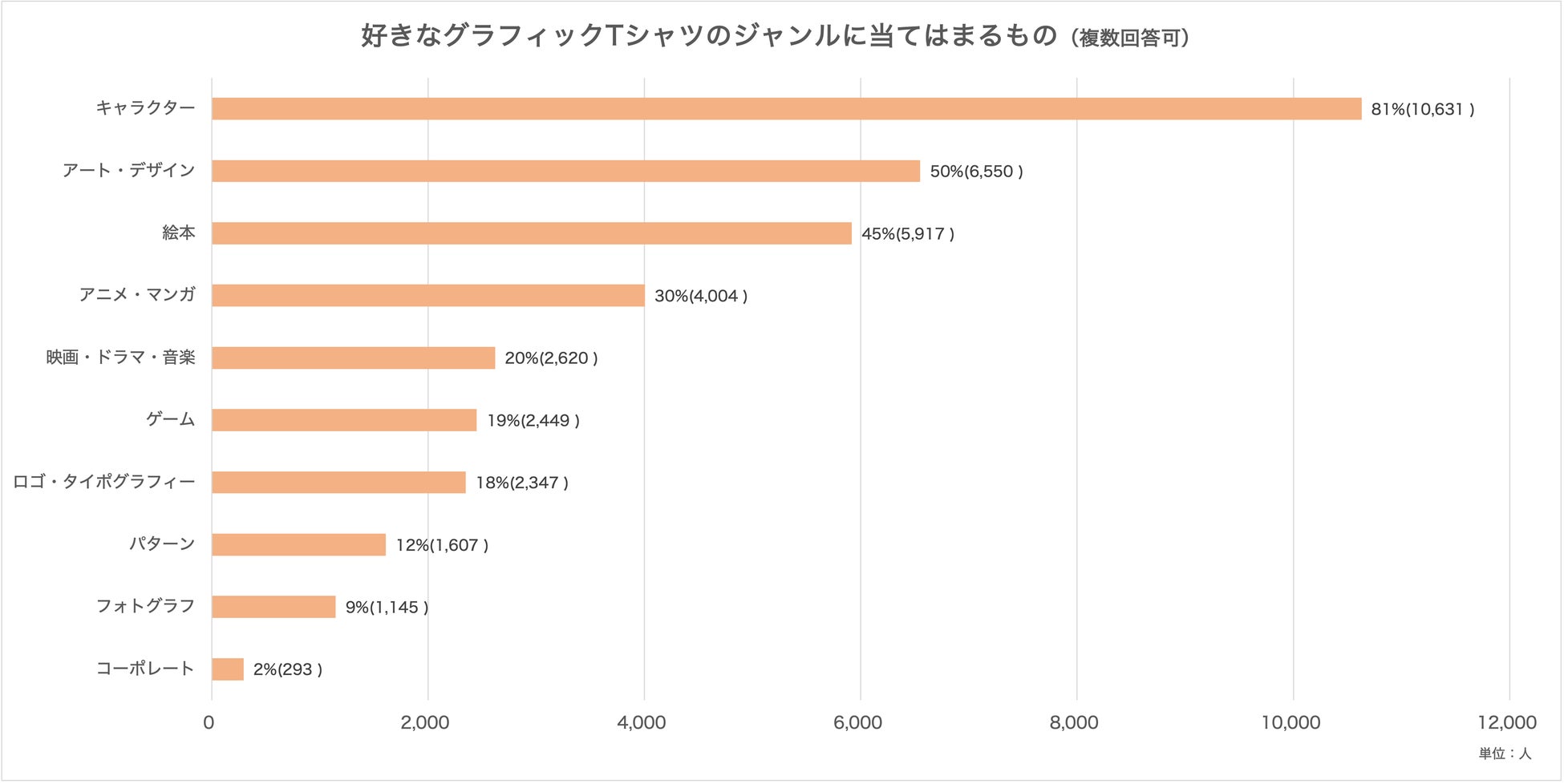 ・「好きなグラフィックTシャツのジャンル」として、回答者全体の約81%が「キャラクター」を選択。