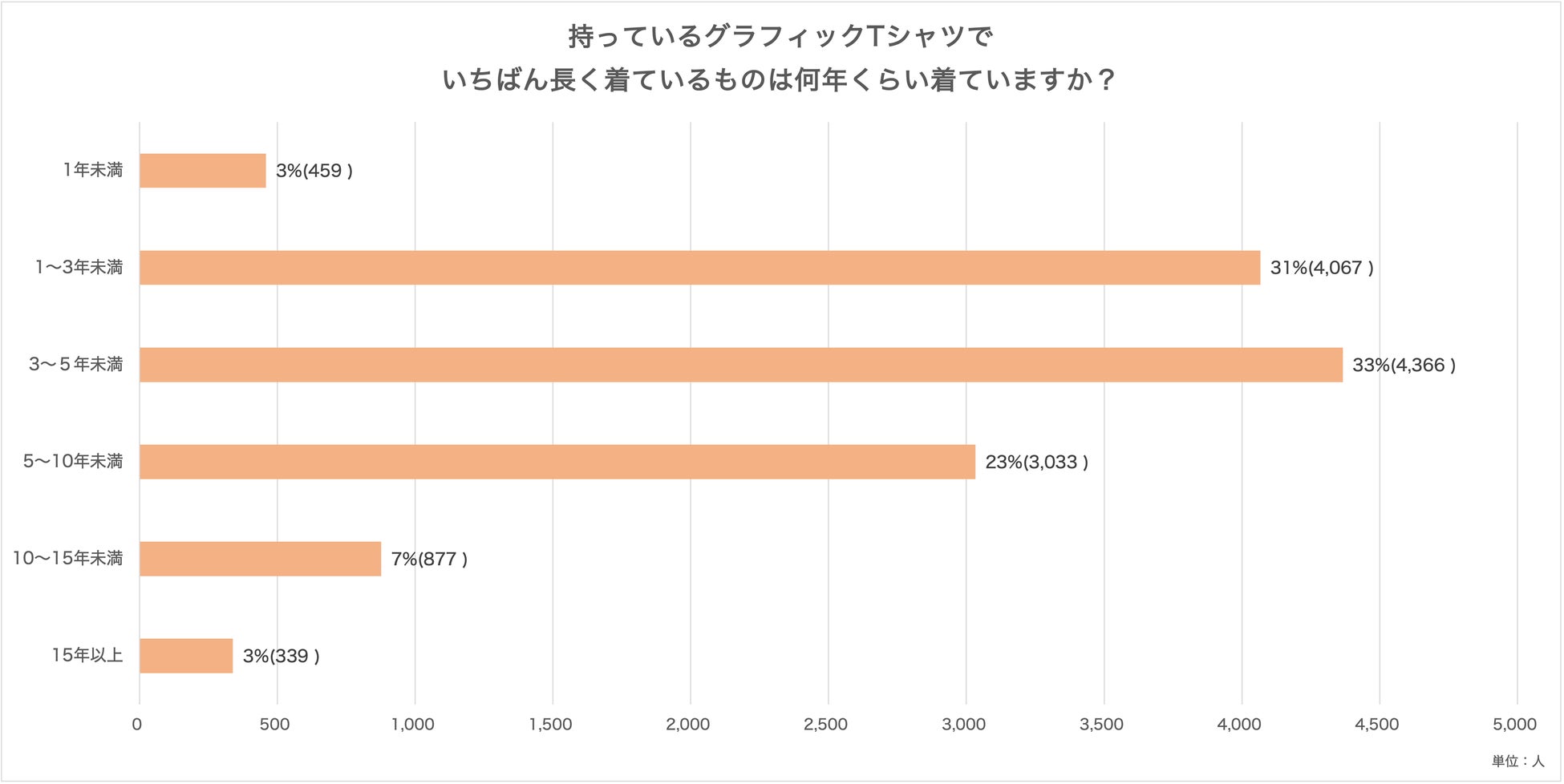 ・「いちばん長く着ているグラフィックTシャツ」は「3〜5年未満」がもっとも多いが、回答者全体の約10%は10年以上着用。