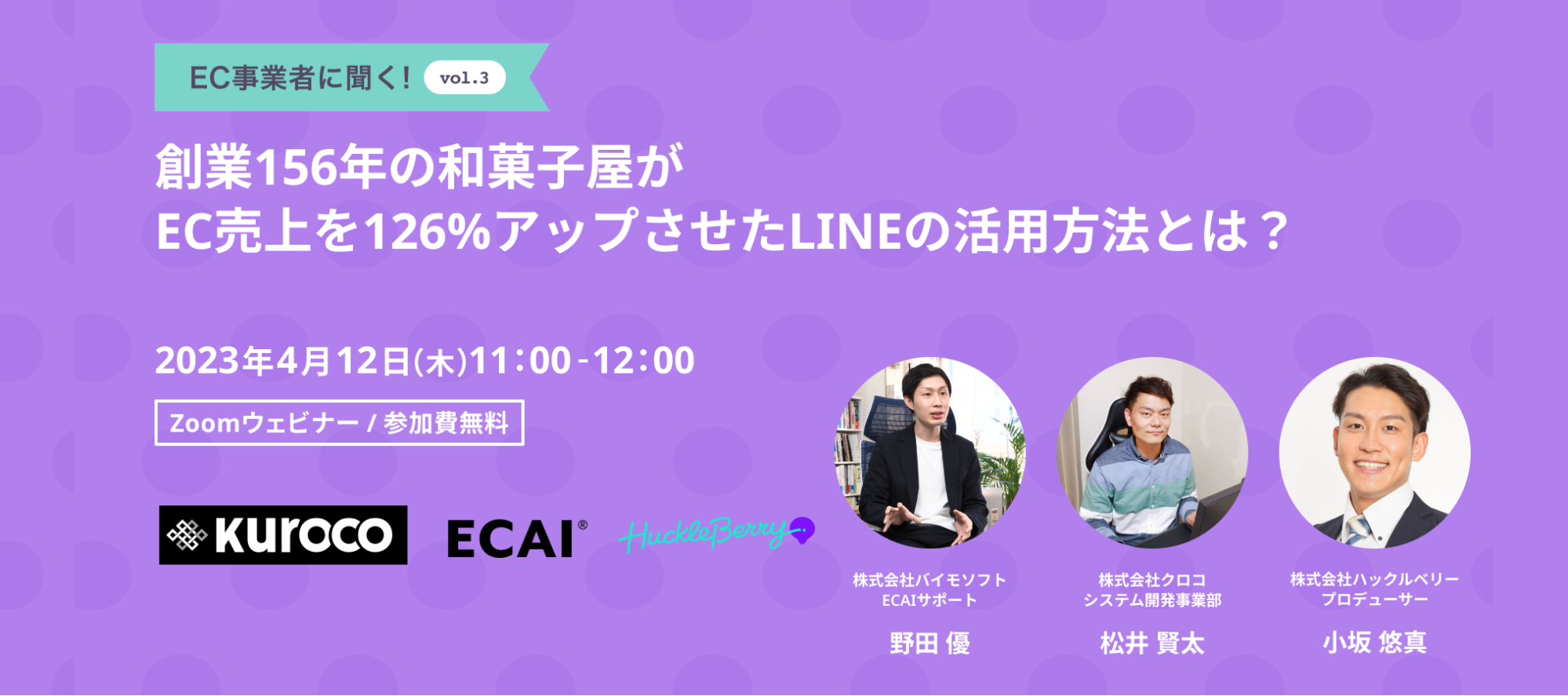 株式会社ハックルベリー(東京都世田谷区、代表取締役社長:安藤 祐輔、以下「ハックルベリー」)は、株式会社バイモソフト、株式会社クロコと3社合同にて、オンラインイベント「創業156年の和菓子屋がEC売上を126%アップさせたLINEの活用方法とは?」を開催することをお知らせします。
