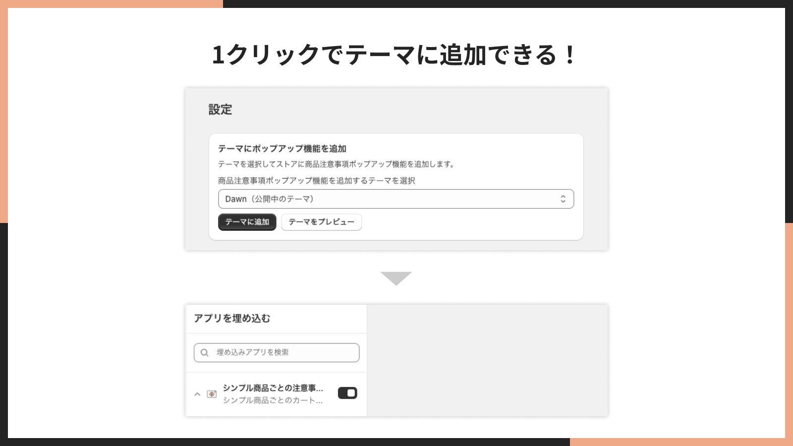 アプリをインストールした後、管理画面の「テーマに追加」ボタンをクリックするだけで、現在適用中のテーマへポップアップ機能を自動挿入。テーマファイルを直接編集する必要がなく、導入にかかる手間とリスクを最小限に抑えます。