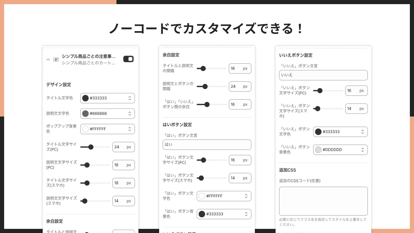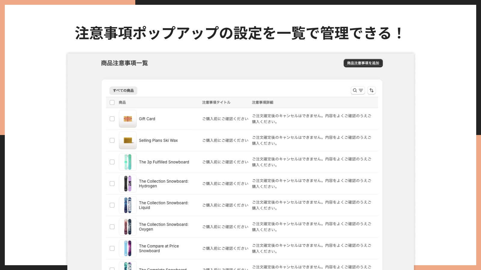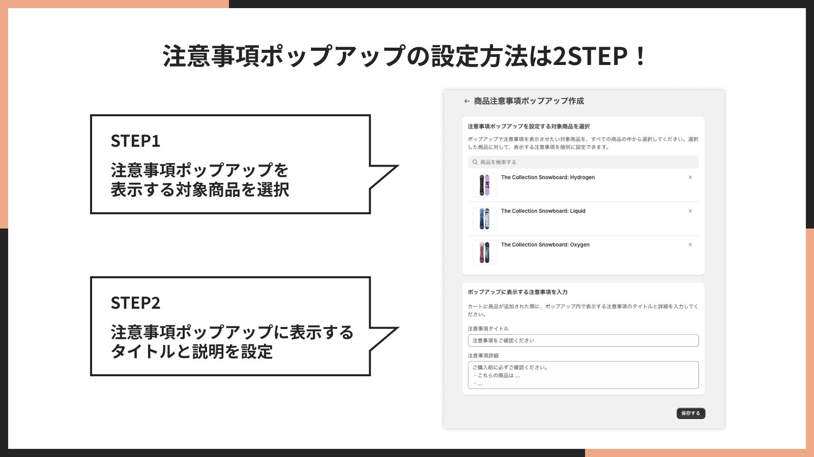 管理画面でポップアップを表示したい商品を選択し、タイトルや本文などの注意事項を入力するだけの2ステップで完了。複雑な手順は一切なく、初めて利用するマーチャントでも迷わず設定できるシンプルな操作性を提供します。