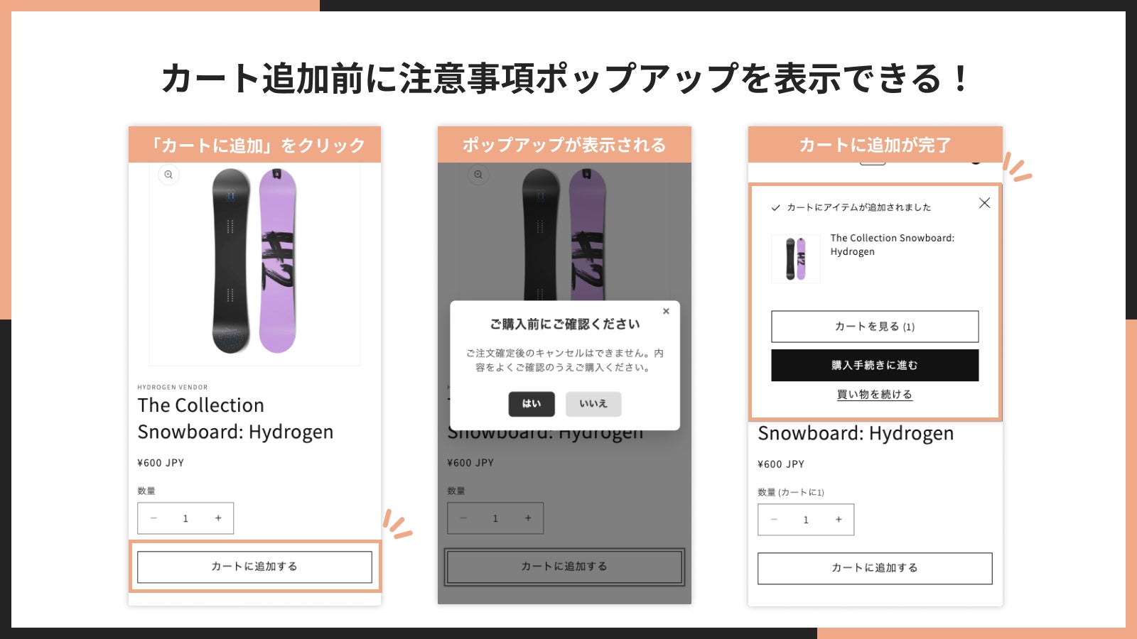 商品をカートに追加する直前に、あらかじめ設定した注意点や利用規約を必ず顧客に確認させるポップアップを表示します。これにより、取り扱い注意商品や特別な配送条件、返品ポリシーなどの重要情報を見落とさせず、購入後のトラブル低減と顧客満足度向上を同時に実現します。