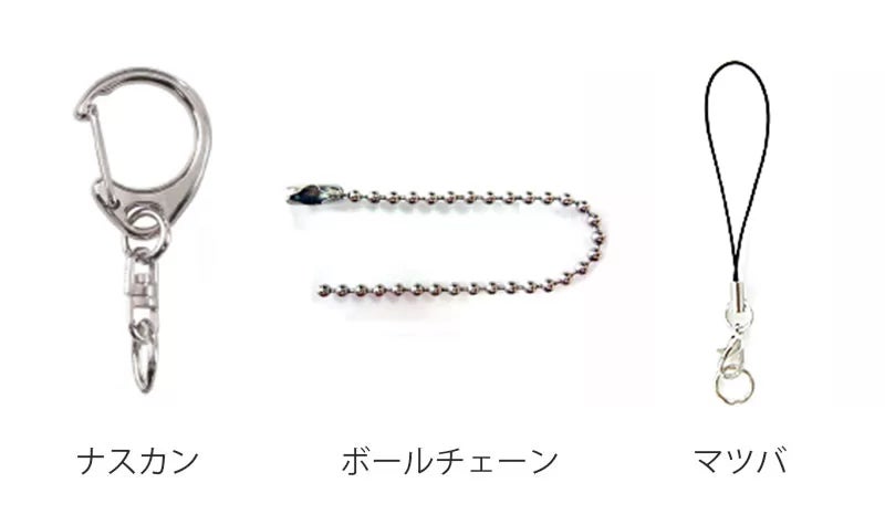ナスカン・ボールチェーン・マツバの3種類のストラップが無料で選択可能。お好みに合わせてカスタマイズしていただけます。