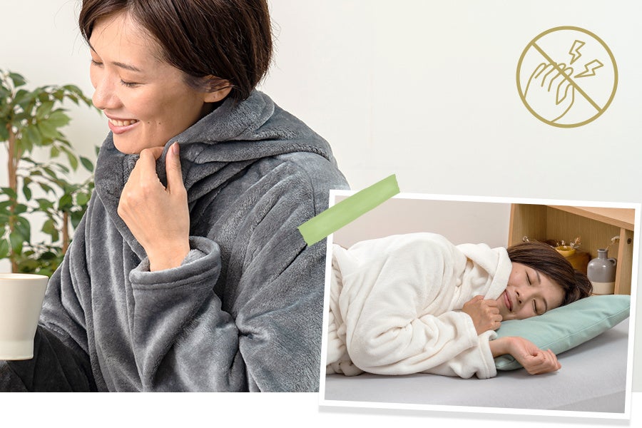 吸湿発熱素材を採用し、サッと羽織るだけですぐ温かい「着る毛布」。 着たまま作業が快適にできるよう着丈アレンジも可能。