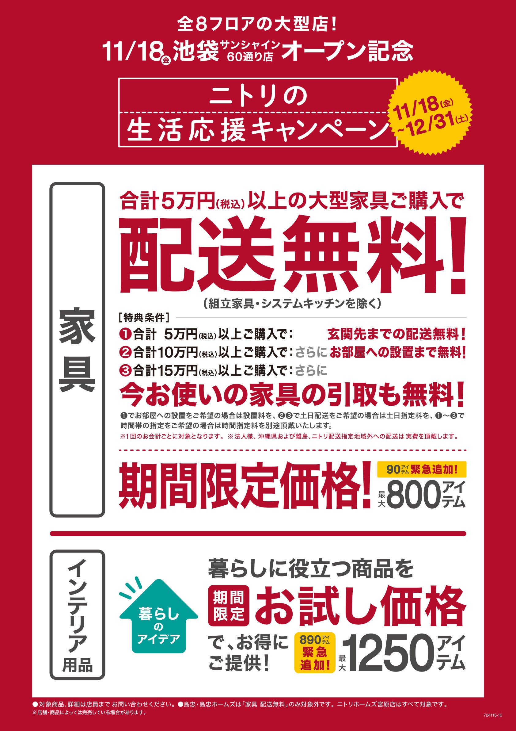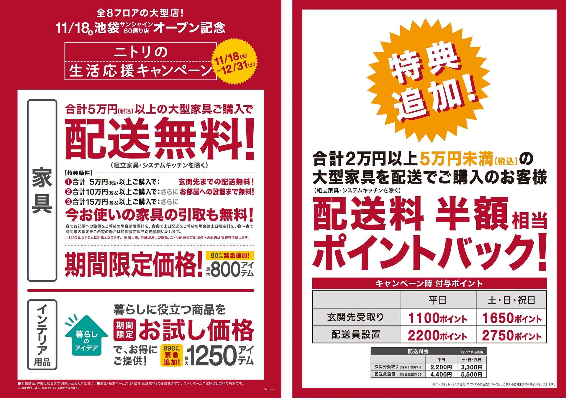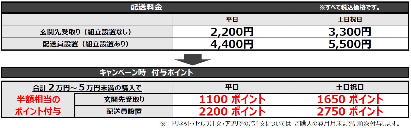 株式会社ニトリ(本社:札幌市北区 代表取締役社長:武田 政則 以下:ニトリ)は、11月18日(金)から12月31日(土)まで期間限定で「生活応援キャンペーン」を全国で実施します。このたび緊急で、期間限定価格980アイテムを追加し、税込み合計2万円から5万円未満の大型家具配送のご注文におきましては、配送料金半額相当のポイントバックを実施いたします。