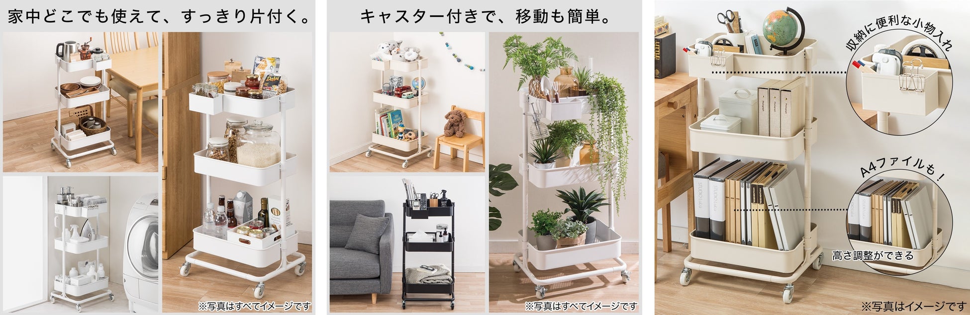 可動棚でお好きな位置に高さも調整できて、キャスターが付いているので清掃時などの移動も簡単。おしゃれなシンプルデザインで、ベーシックな4色展開なので、どんなスタイルのお部屋にも合わせられます。