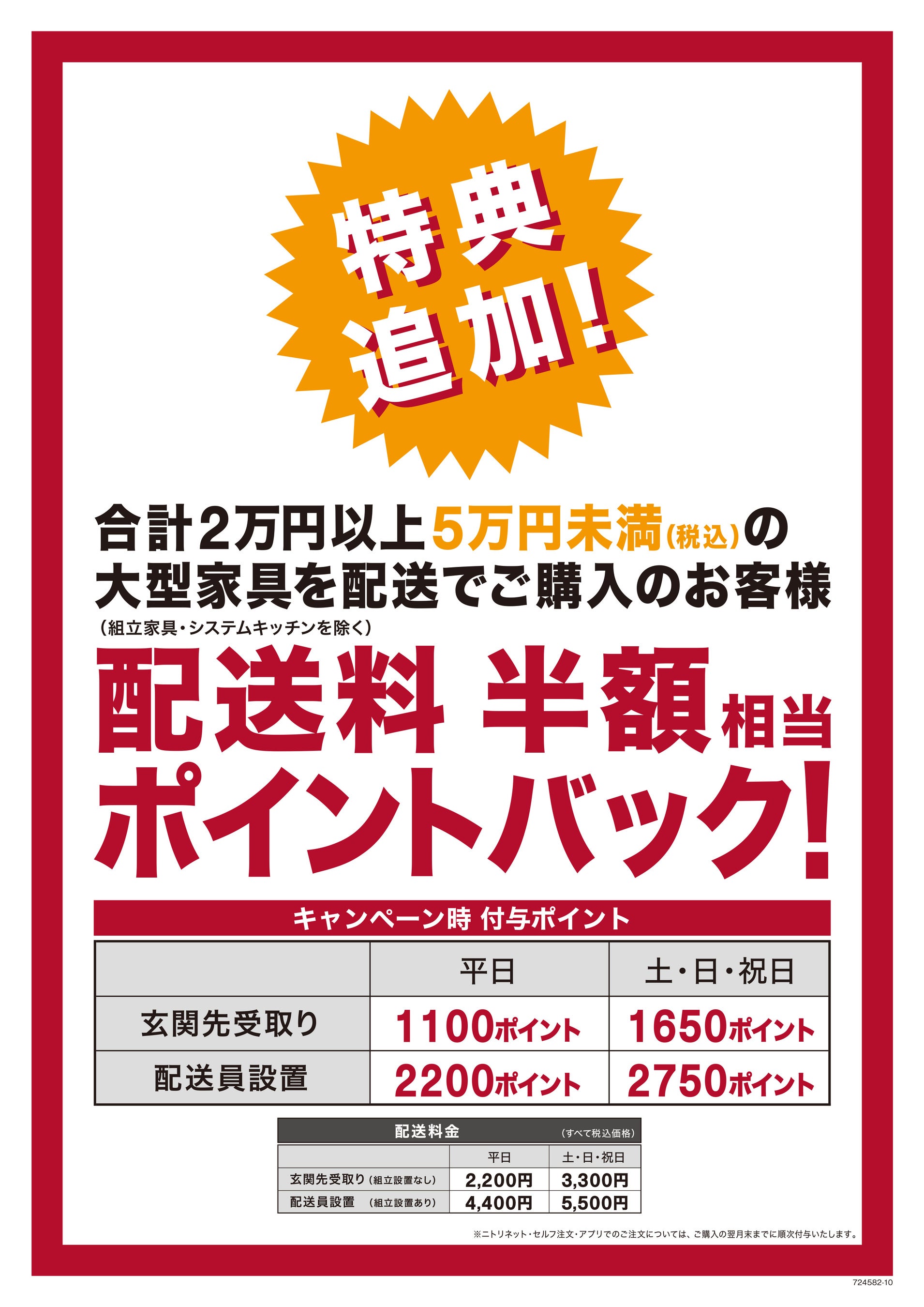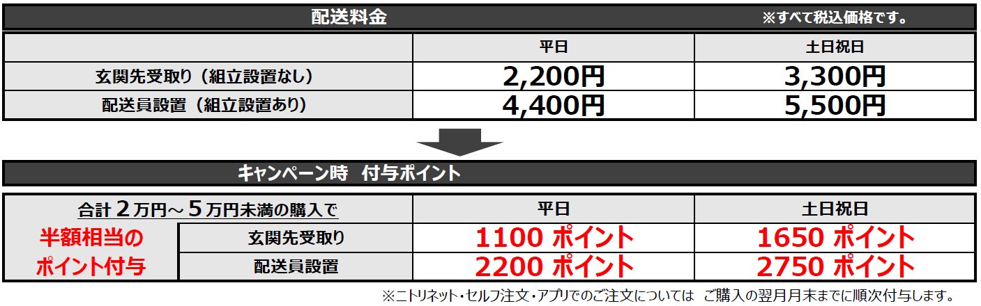 加えて、この度緊急で、税込み合計2万円から5万円未満の大型家具配送のご注文におきまして、配送料金半額相当のポイントを付与する運びとなりました。