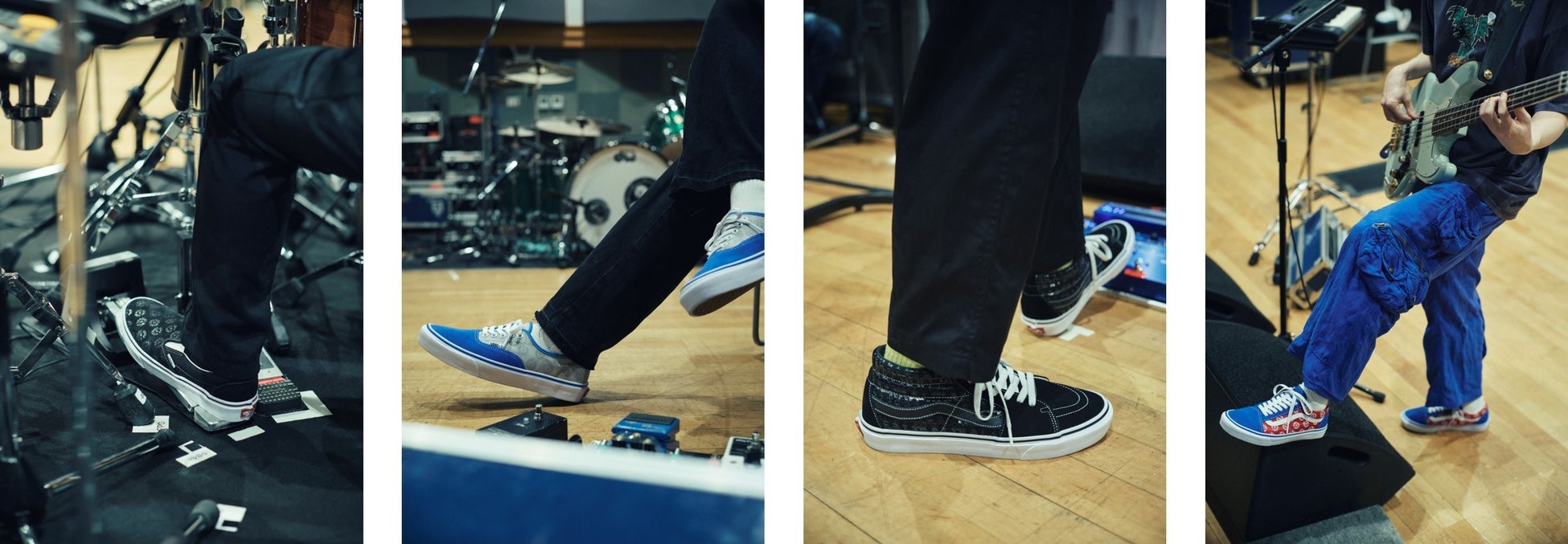 シンプルなブラック/ホワイトと、鮮やかな印象を与えるブルー/グレイのカラーパターンでは“BUMP OF CHICKEN”のサークルロゴが同色でプリントされており普段使いもしやすいデザインに。またポップさの残るヴィンテージVansでも度々登場するブルー/レッドのカラーパターンのOld Skool、ブラック/ブラックのシックなカラーに“BOC”ロゴを採用したSk8-Midという、幅広い6種のラインナップとなりました。