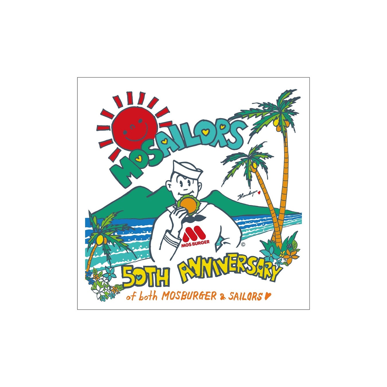 コラボバンダナは、セーラーズのオーナーデザイナーである三浦静加さんによってデザインされました。「50TH ANNIVERSARY」の文字とともに、「MOS」の由来である山(Mountain)、海(Ocean)、太陽(Sun)のイラストと、セーラーズのシンボルである「セーラーくん」が描かれています。60cm×60cmと大きめのサイズになっており、風呂敷としてもご利用いただける便利なバンダナです。