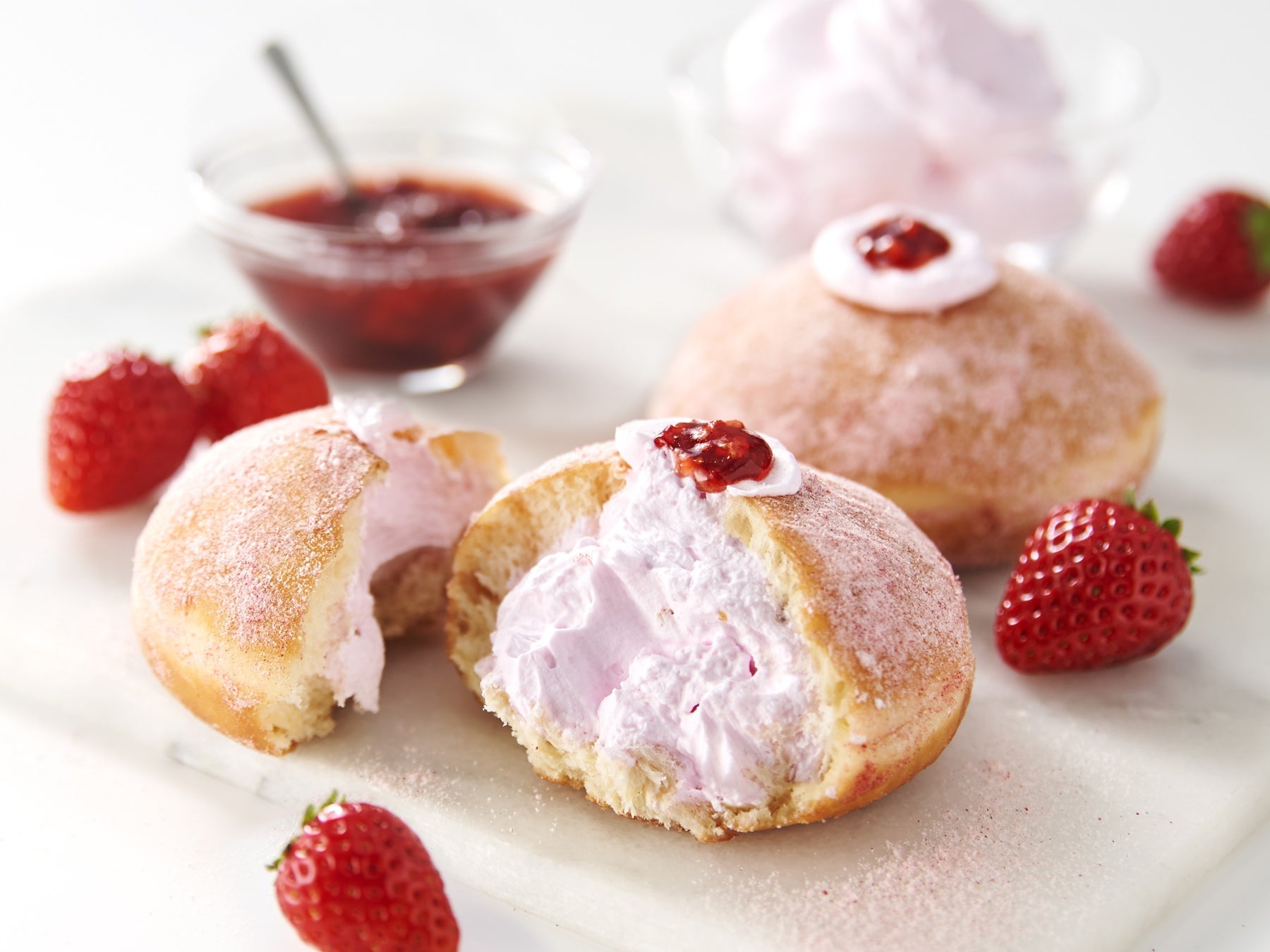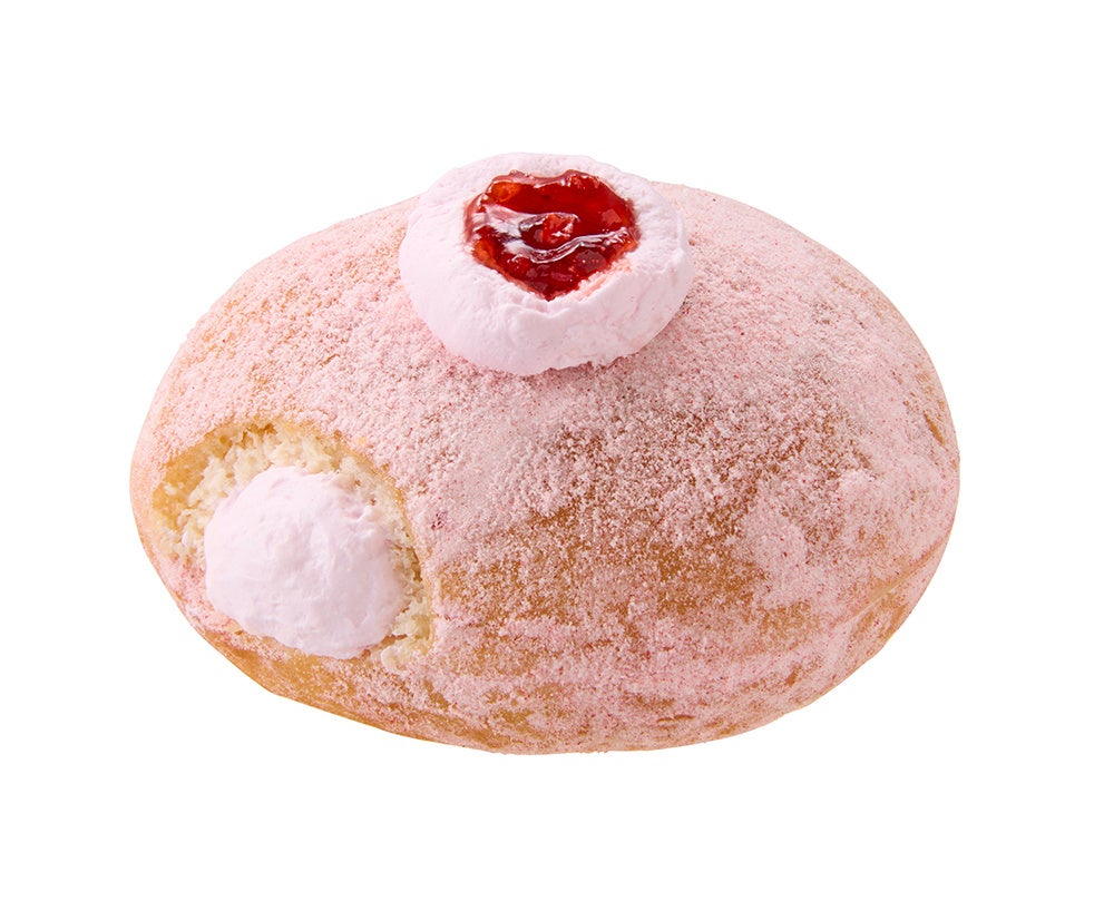 ふわっとやわらかいドーナツ生地の中にストロベリーホイップクリームをKKDJ史上最もふんだんに詰め、表面には甘酸っぱいストロベリーシュガーをまぶし、さらにストロベリーホイップクリームをのせた上にアクセントとしてストロベリーソースをトッピング。ひとくち頬張るとストロベリーの甘酸っぱさとクリームの甘さが口いっぱいに広がる、春の訪れを感じさせる一品です。