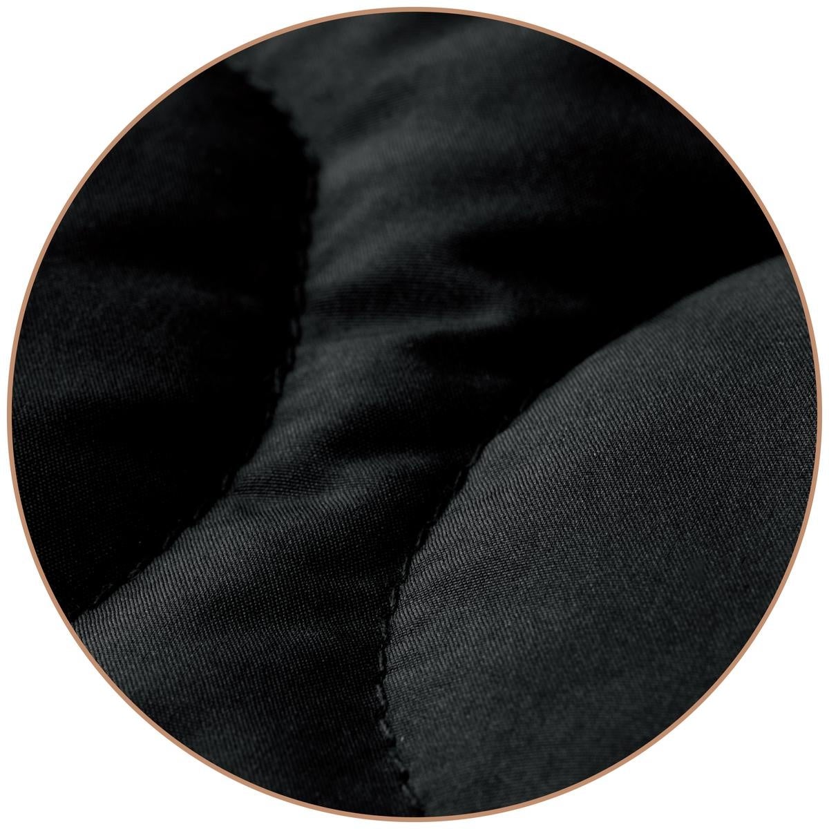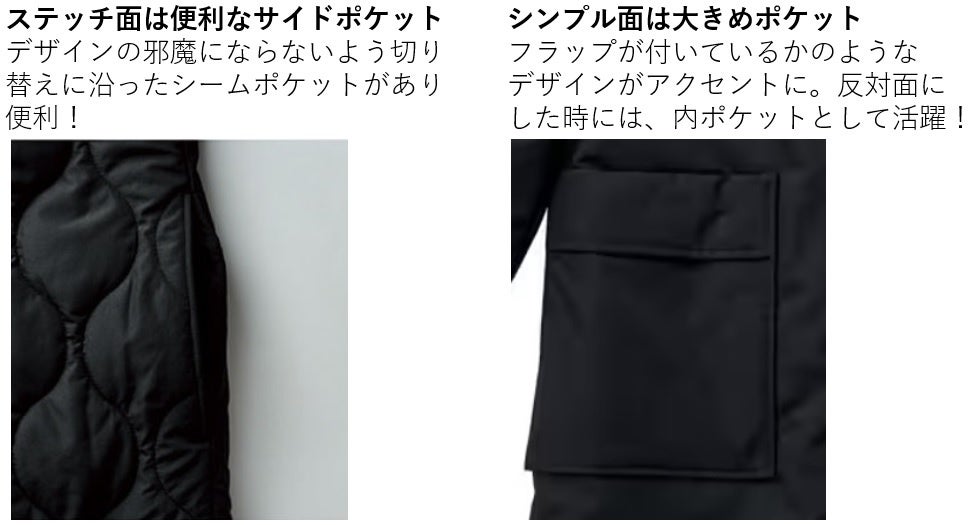 シンプル面は大きなポケットがポイントのデザインでマットなピーチ素材。キルティング面は優しい曲線を描いたステッチ柄で、微光沢なタフタ素材。キルティング面のみはっ水加工つき!中わたは極細のポリエステル繊維わたで軽くて暖かい!