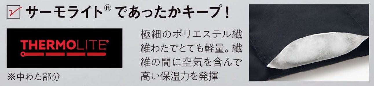 中わたにはサーモライト®を使用し、保温性が高いうえに、軽いので着心地がとてもラクです。