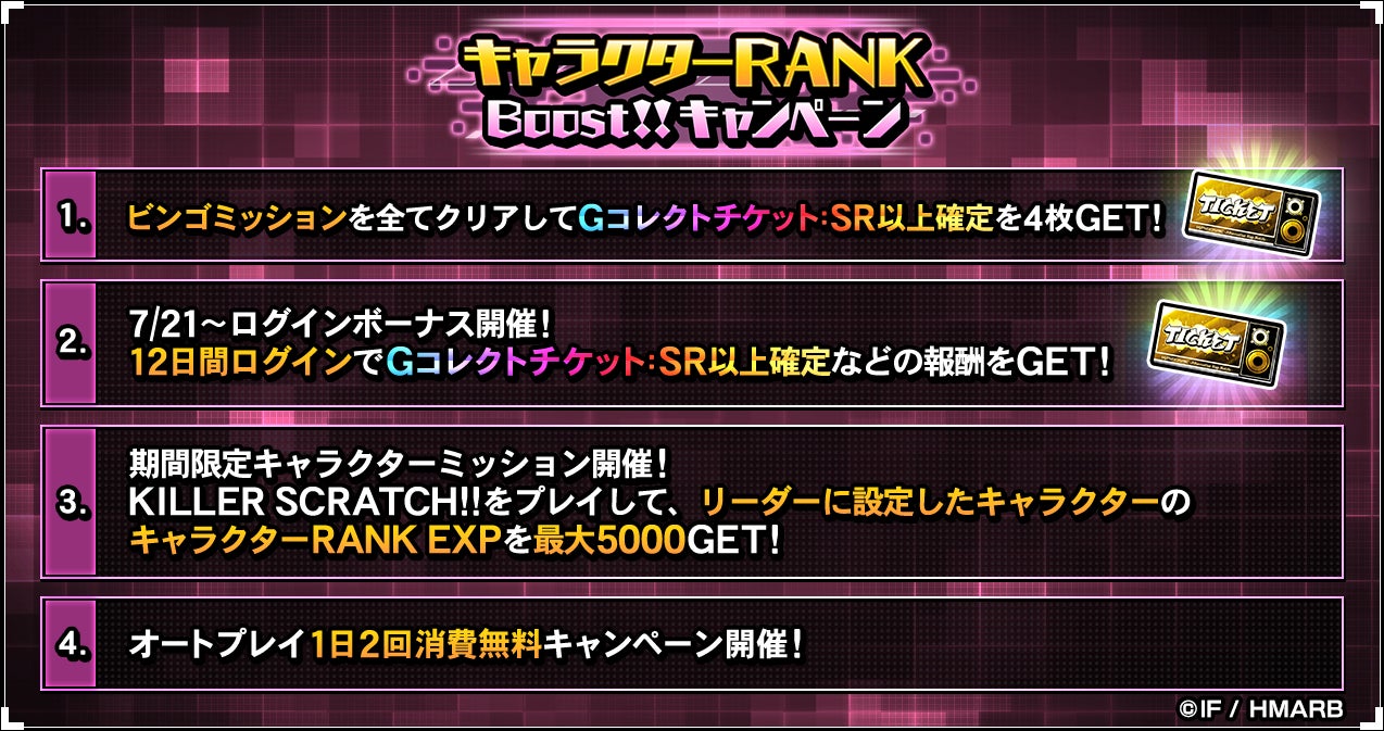 期間中、キャラクターRANK EXPを各キャラクター最大5,000獲得できるキャラクターミッションをはじめ、ビンゴミッションやログインボーナスを開催しています。ビンゴミッションをすべてクリアすることでSR以上のカードが獲得できるGコレクトチケットを入手することもできます。詳細はアプリ内お知らせをご確認ください。
