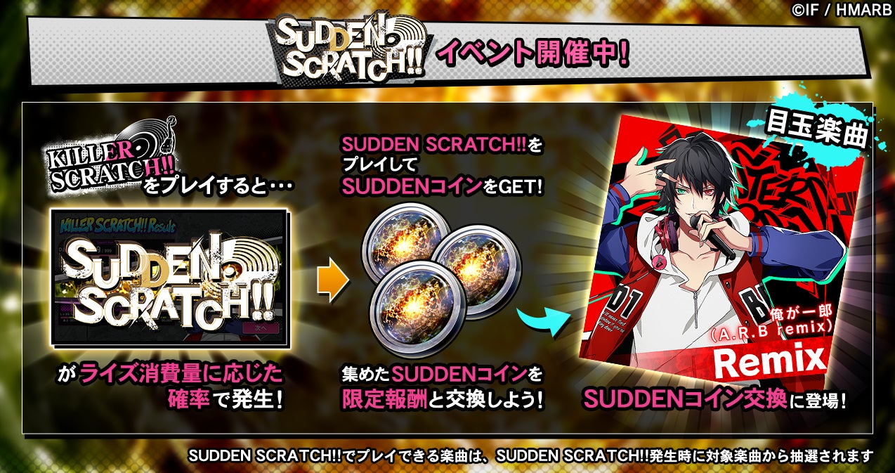 イベント期間中、KILLER SCRATCH!!をプレイするとライズ消費量に応じた確率でSUDDEN SCRATCH!!が発生します。SUDDEN SCRATCH!!をプレイすると、通常の報酬アイテムの他、限定アイテム「SUDDENコイン」を獲得することができます。「SUDDENコイン」を集めることで、新楽曲「俺が一郎(A.R.B remix)」と交換することが可能です。詳細はアプリ内お知らせをご確認ください。
