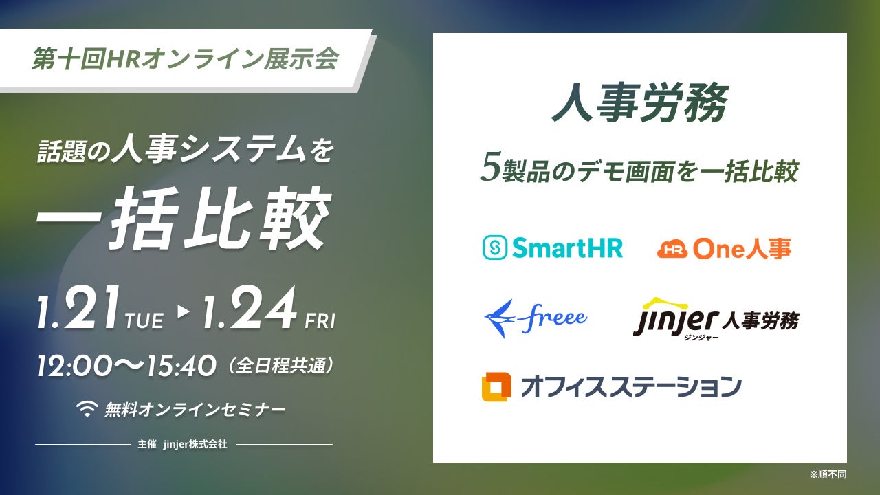 ワンストップ人事労務システム「One人事」 を提供するOne人事株式会社(本社:東京都品川区、代表取締役社長:唐沢雄三郎)は、jinjer株式会社(本社:東京都新宿区、代表取締役社長:桑内孝志)が主催する人事システム比較セミナー「第十回HRオンライン展示会」への登壇が決定したことをお知らせします。
