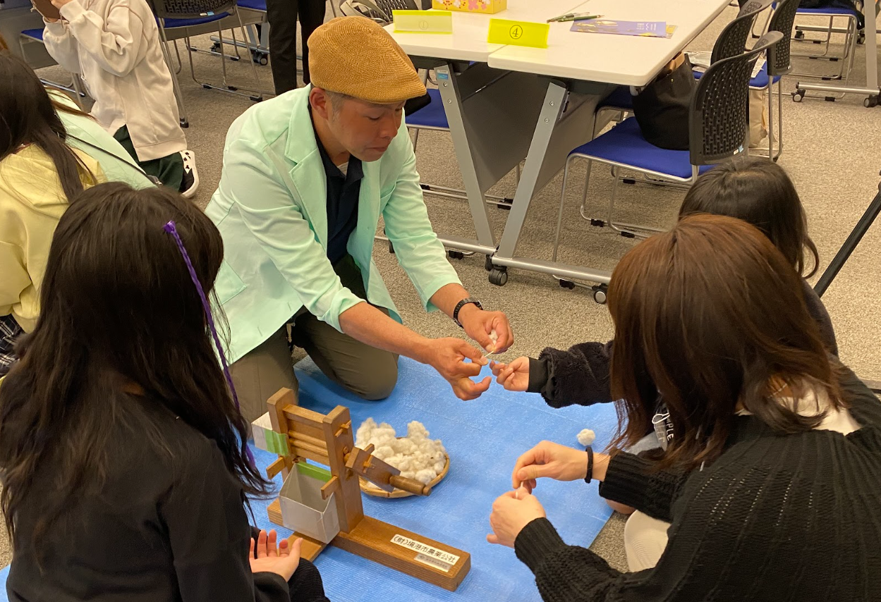 次に地球に優しい「コットン」についてのクイズや、境港市の特産品である伯州綿の起源や歴史について学んだのち、昔ながらの道具を用いて、実際に綿くり体験をしていただきました。
