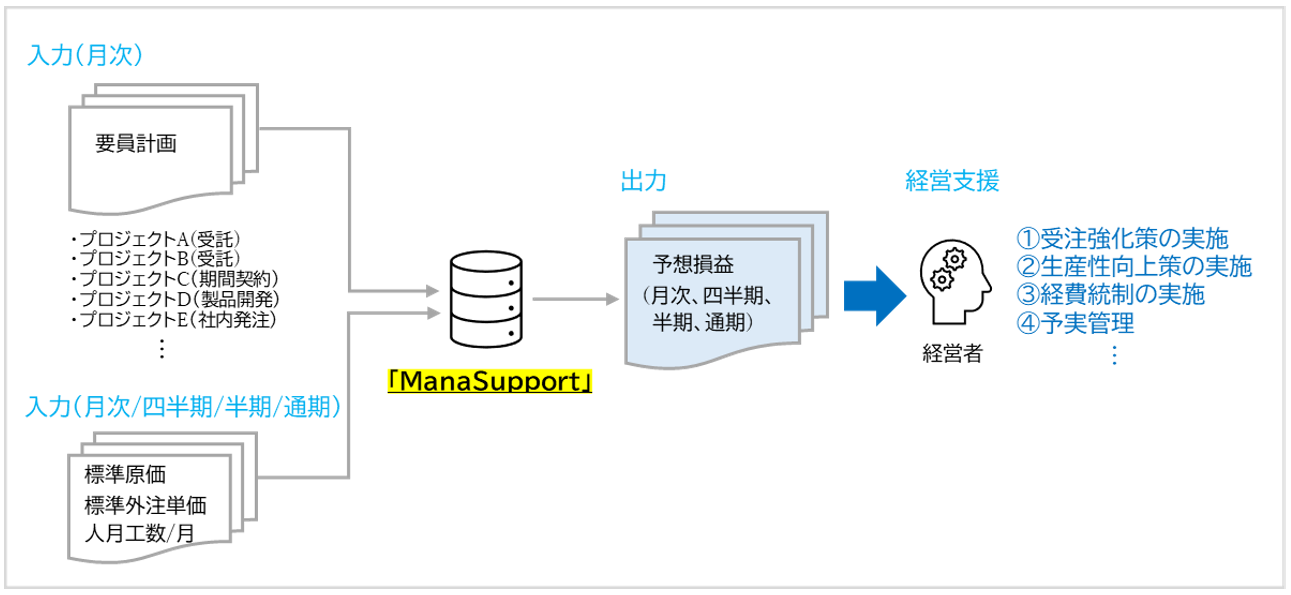 「ManaSupport」は、必要最小限のインプット情報から想定される業績や利益の見通しを把握し、経営判断をサポートする予想損益シミュレーションツールです。