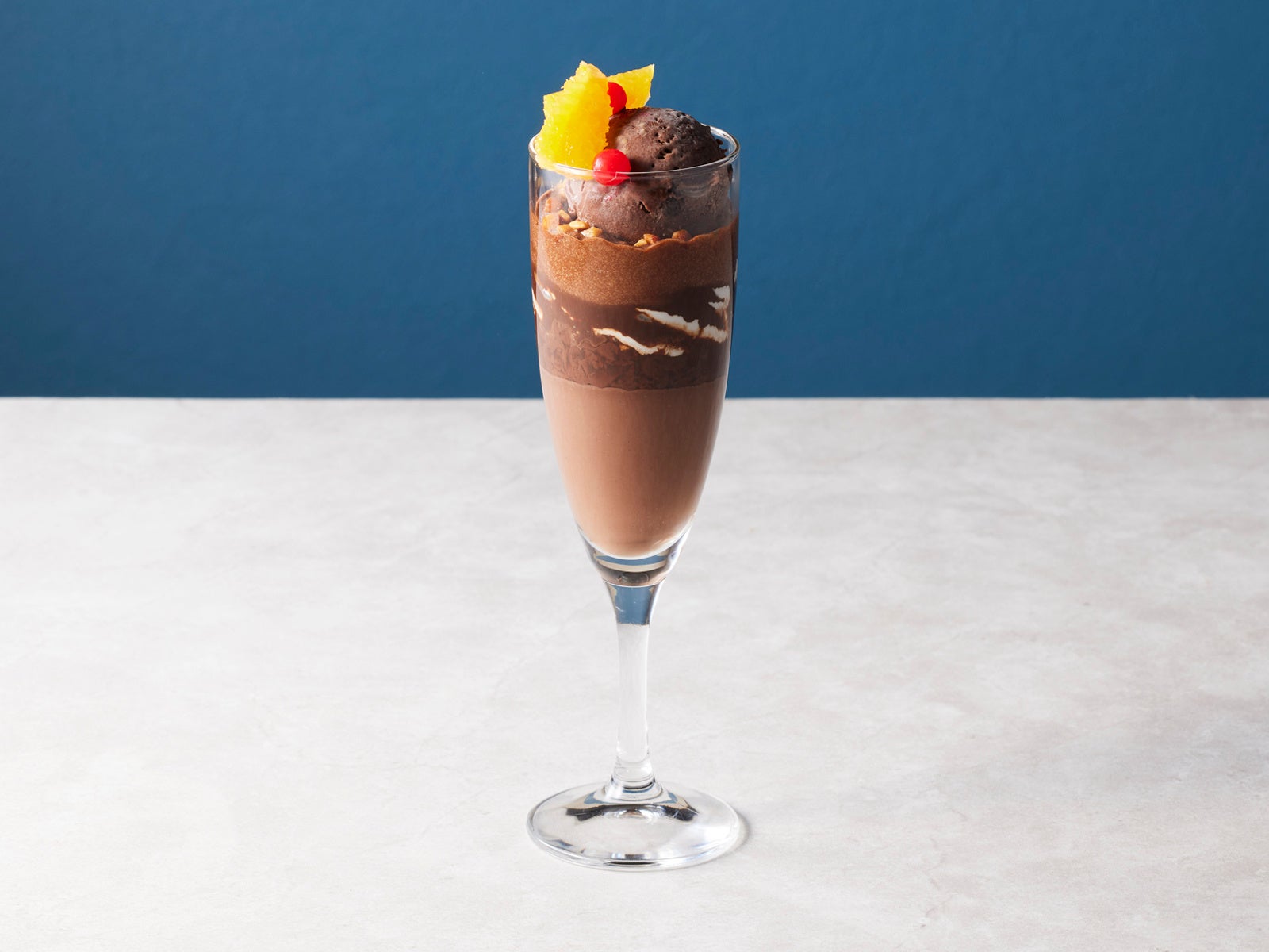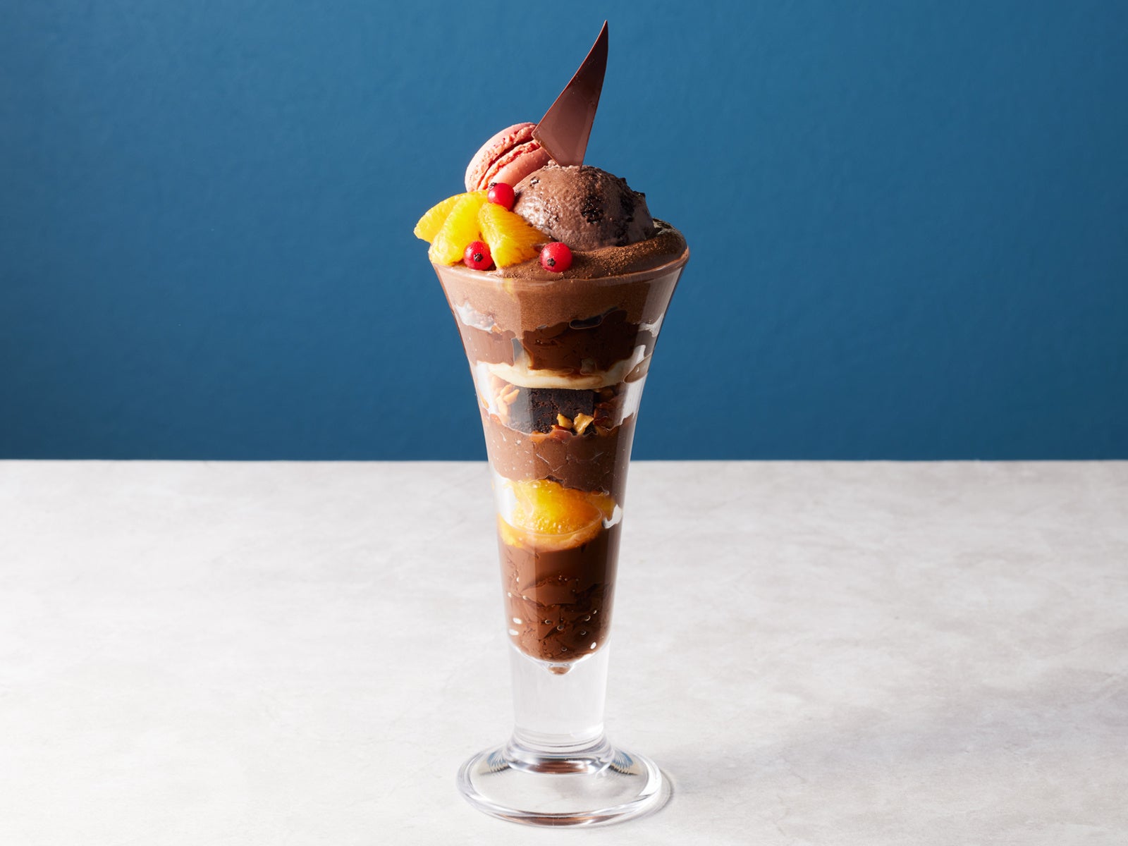 ほろ苦いチョコアイスや口どけのよいビターチョコクリーム、まろやかな味わいのチョコプリンなど、たっぷりのショコラで織りなす、まさに“ショコラづくし”のパフェです。上部に飾ったオレンジやラズベリーマカロン、フローズンスグリなどで華やかな見た目に仕上げました。