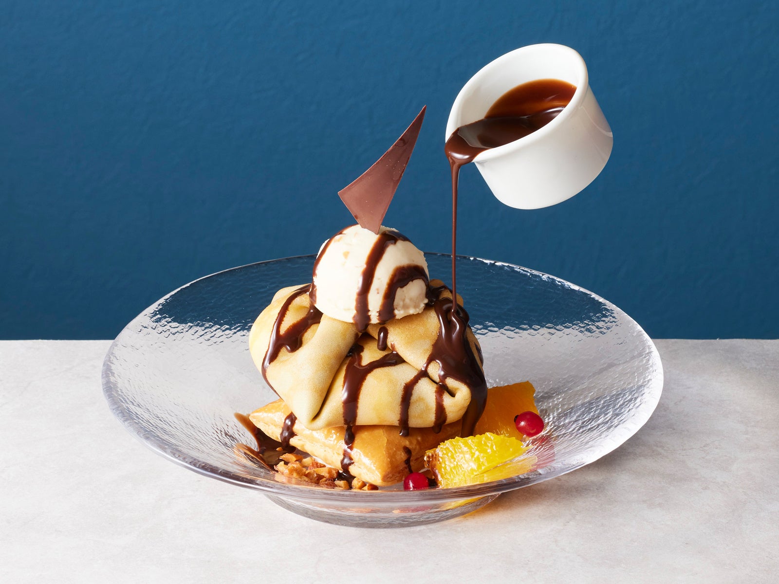 濃厚なショコラをさくさくパイともちもちクレープで味わう満足感たっぷりの一皿です。もちもちクレープの中には、たっぷりのビターチョコクリームとホイップの“Wクリーム”が入っています。とろ~っとしたクリームをさくさくパイやもちもちクレープ、キャラメルの甘みとほのかな塩味を感じる塩キャラメルアイスと一緒にお楽しみください。お好みで別添えのチョコソースをかけると、一層濃厚な味わいをお楽しみいただけます。
