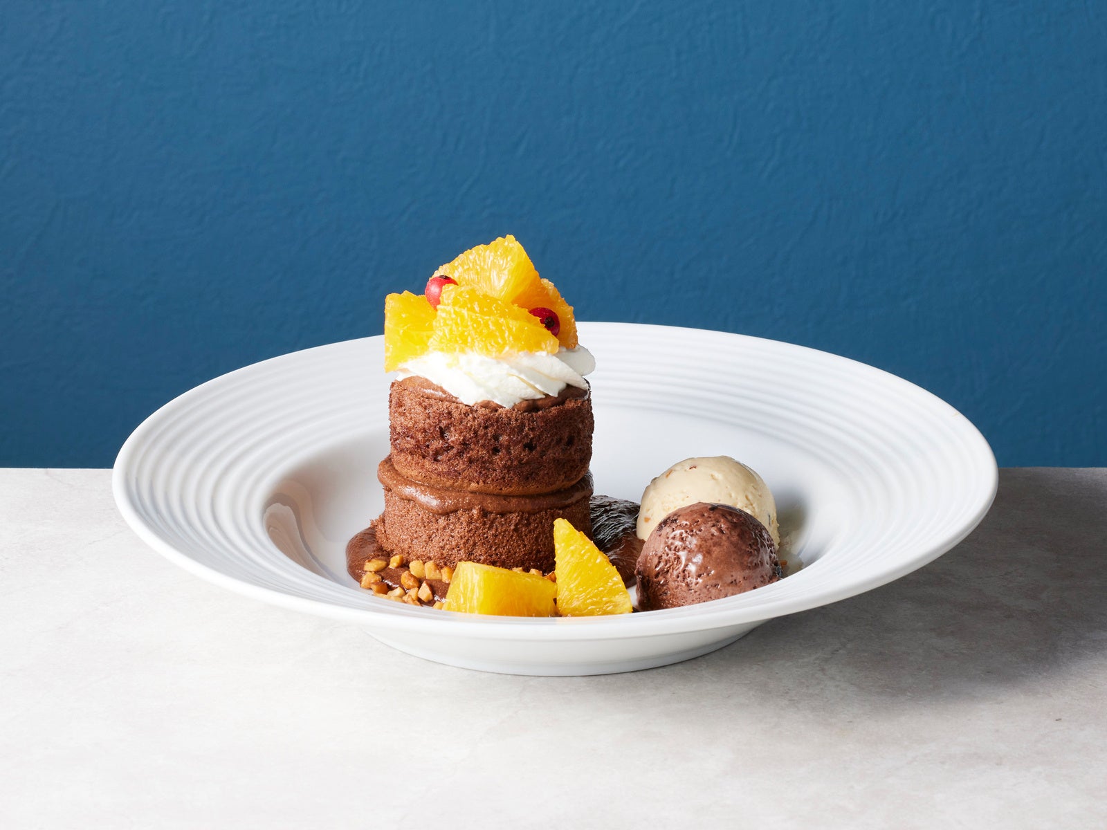2段に重ねたふわふわチョコスポンジの上に、ホイップとオレンジを可愛らしく盛り付けたケーキです。チョコスポンジのトップと2段に重ねたスポンジの間にもオレンジゼストとビターチョコクリームを挟むことで、“ショコラ×オレンジ”のマリアージュを心ゆくまでご堪能いただけます。プレートに添えた、チョコアイスや塩キャラメルアイスと一緒にお楽しみください。