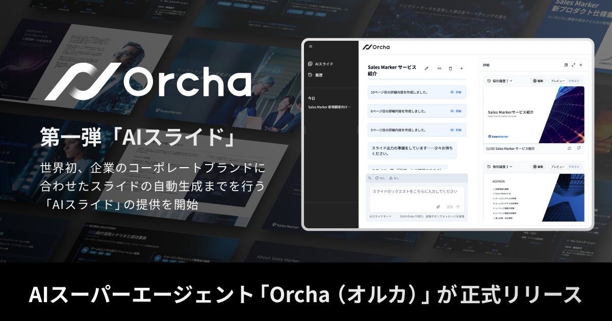 国内初※2「顧客起点」で営業やマーケティング活動を戦略的に自動化する新しい成長モデル「インテントセールス」を実現する『Sales Marker(セールスマーカー)』を開発・提供する株式会社Sales Marker(本社:東京都渋谷区、代表取締役 CEO:小笠原 羽恭、以下:当社)は、AIスーパーエージェント「Orcha(オルカ)」を正式リリースしたことをお知らせします。