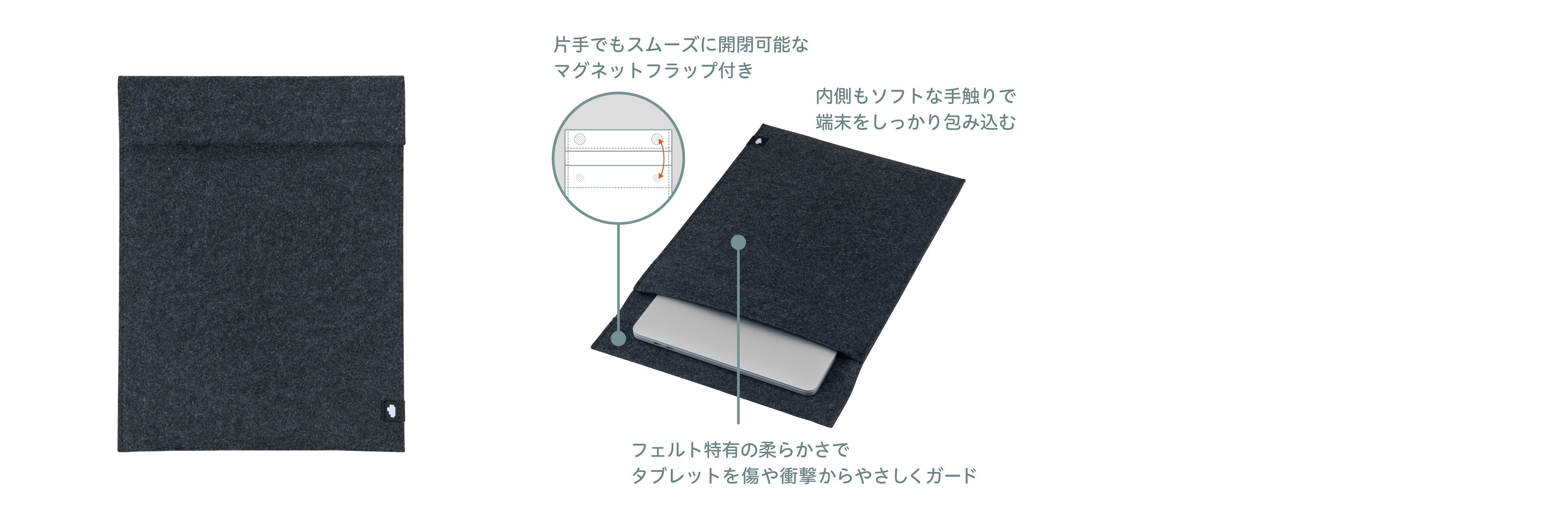 片手でもスムーズに開閉可能なマグネットフラップ付きのタブレットスリーブケース