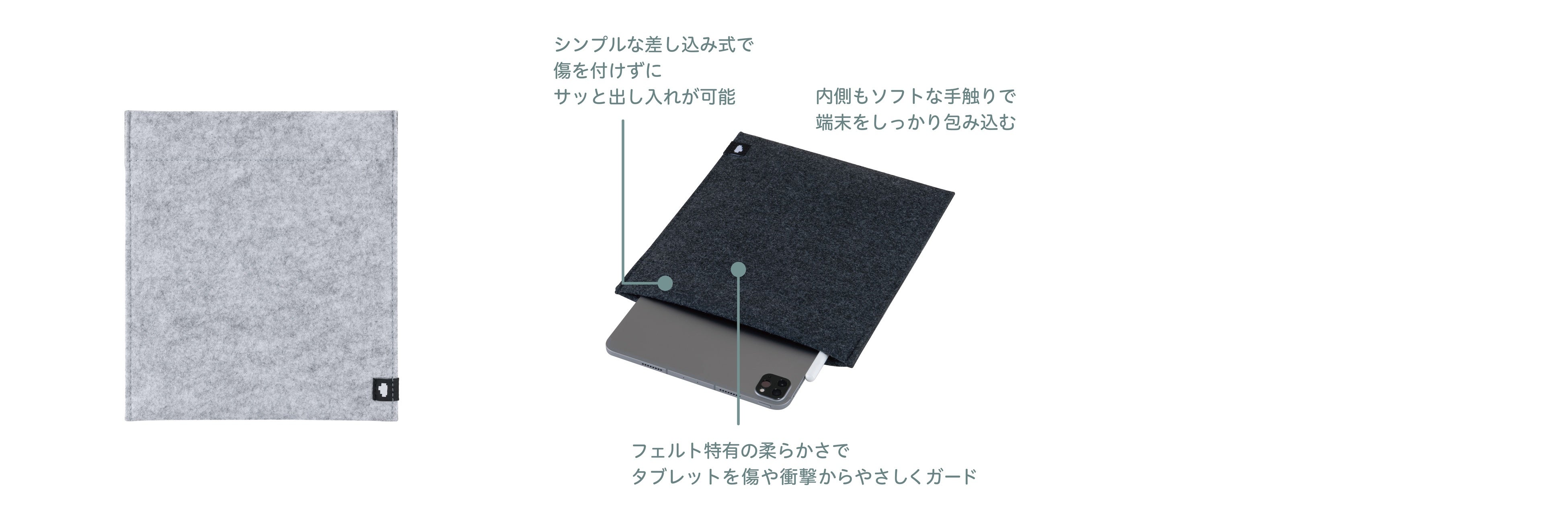 フェルト特有のやわらかさで、タブレットをキズや衝撃からやさしくガード
