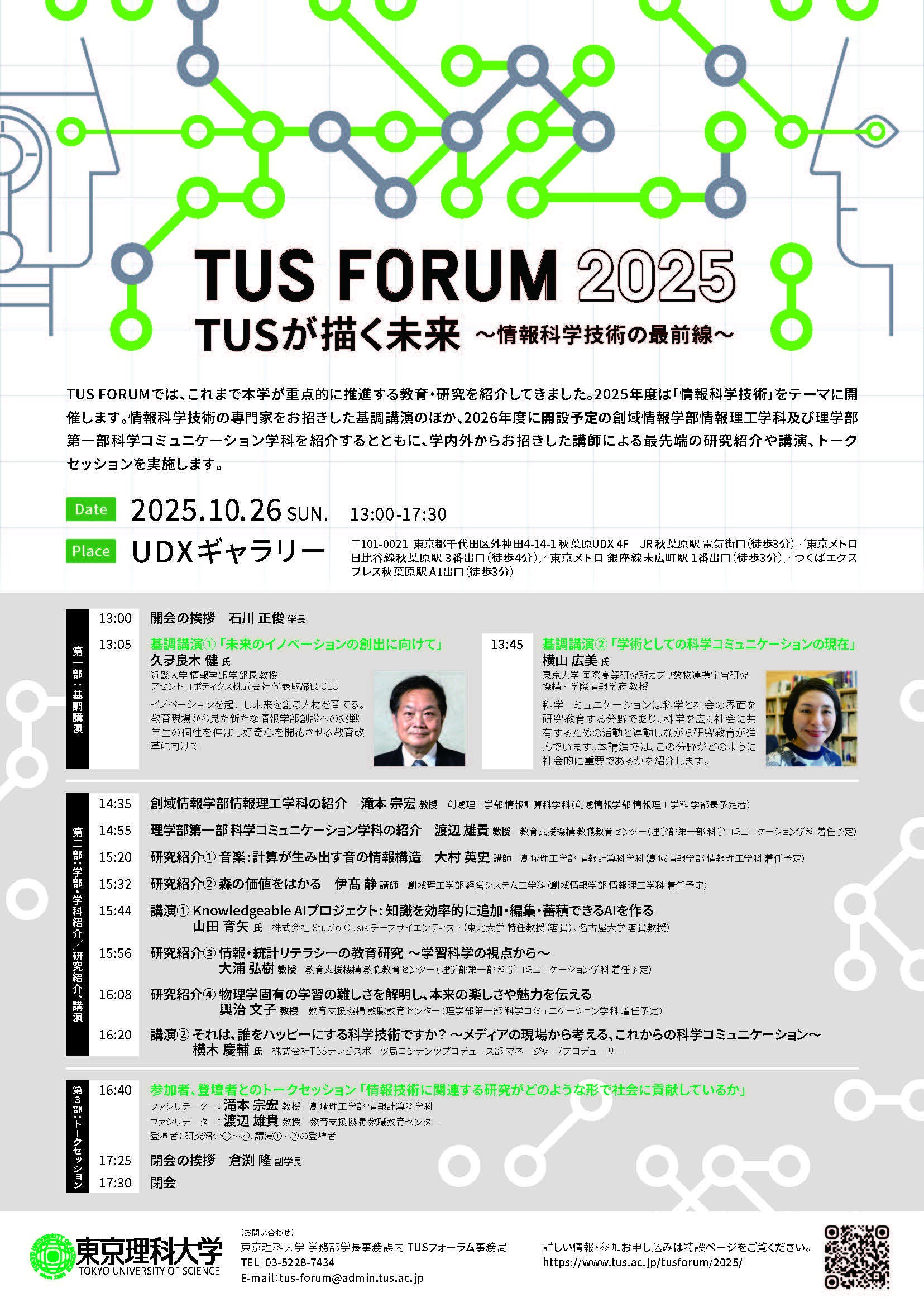 TUS FORUMでは、これまで本学が重点的に推進する教育・研究を紹介してきました。2025年度は「情報科学技術」をテーマに開催します。情報科学技術の専門家をお招きした基調講演のほか、2026年度に開設予定の創域情報学部情報理工学科及び理学部第一部科学コミュニケーション学科を紹介するとともに、学内外からお招きした講師による最先端の研究紹介や講演、トーク セッションを実施します。