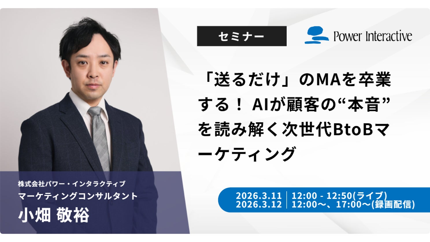 株式会社パワー・インタラクティブは、無料ウェビナー『「送るだけ」のMAを卒業する! AIが顧客の“本音”を読み解く次世代BtoBマーケティング』を、3月11日にライブ開催、3月12日に録画配信を行います。