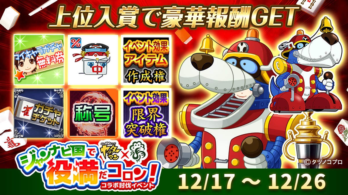 コラボ討伐イベント「ジャンナビ国で役満だコロン!」では、ヤッターマンのキャラクターたちがボスとして出現する討伐イベントです。対局で獲得した攻撃ポイントでキャラクターたちを倒すことで討伐ポイントをGET!