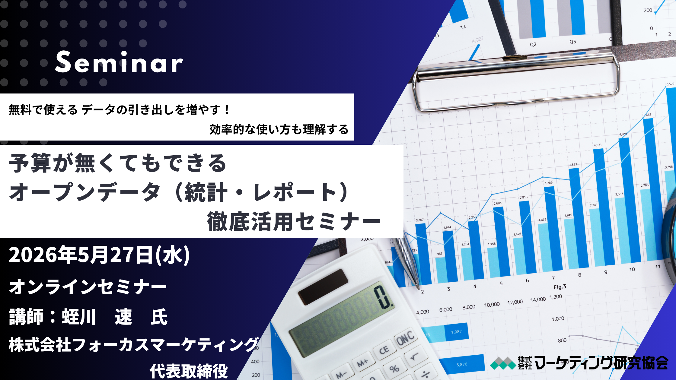 株式会社マーケティング研究協会は2026年5月27日、「予算が無くてもできるオープンデータ(統計・レポート) 徹底活用セミナー」を開催します。