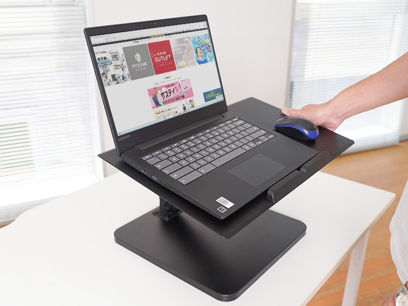 PC作業時背筋が曲がる。気分を変えて立ってパソコン作業をしたい。そんな方におすすめの『片手で簡単昇降ワイドPCスタンド』です。