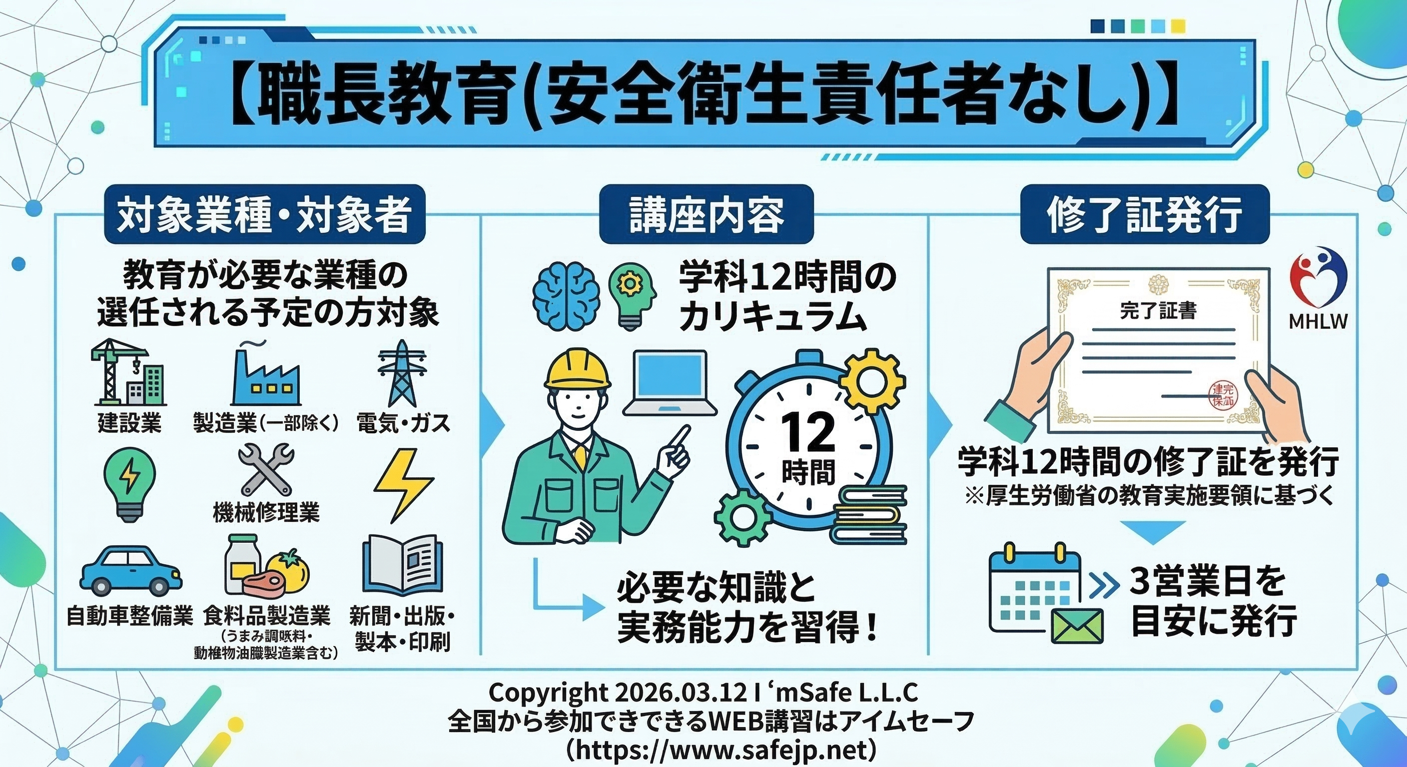 建設業、製造業(一部除く)、電気、ガス、機械修理業、自動車整備業、食料品製造業(うまみ調味料製造業及び動植物油脂製造業は、すでに対象)」、「新聞業、出版業、製本業及び印刷物加工業」など教育が必要な業種の選任される予定の方対象に、必要な知識と実務能力を習得していただくため、学科12時間のカリキュラムによる講習です。