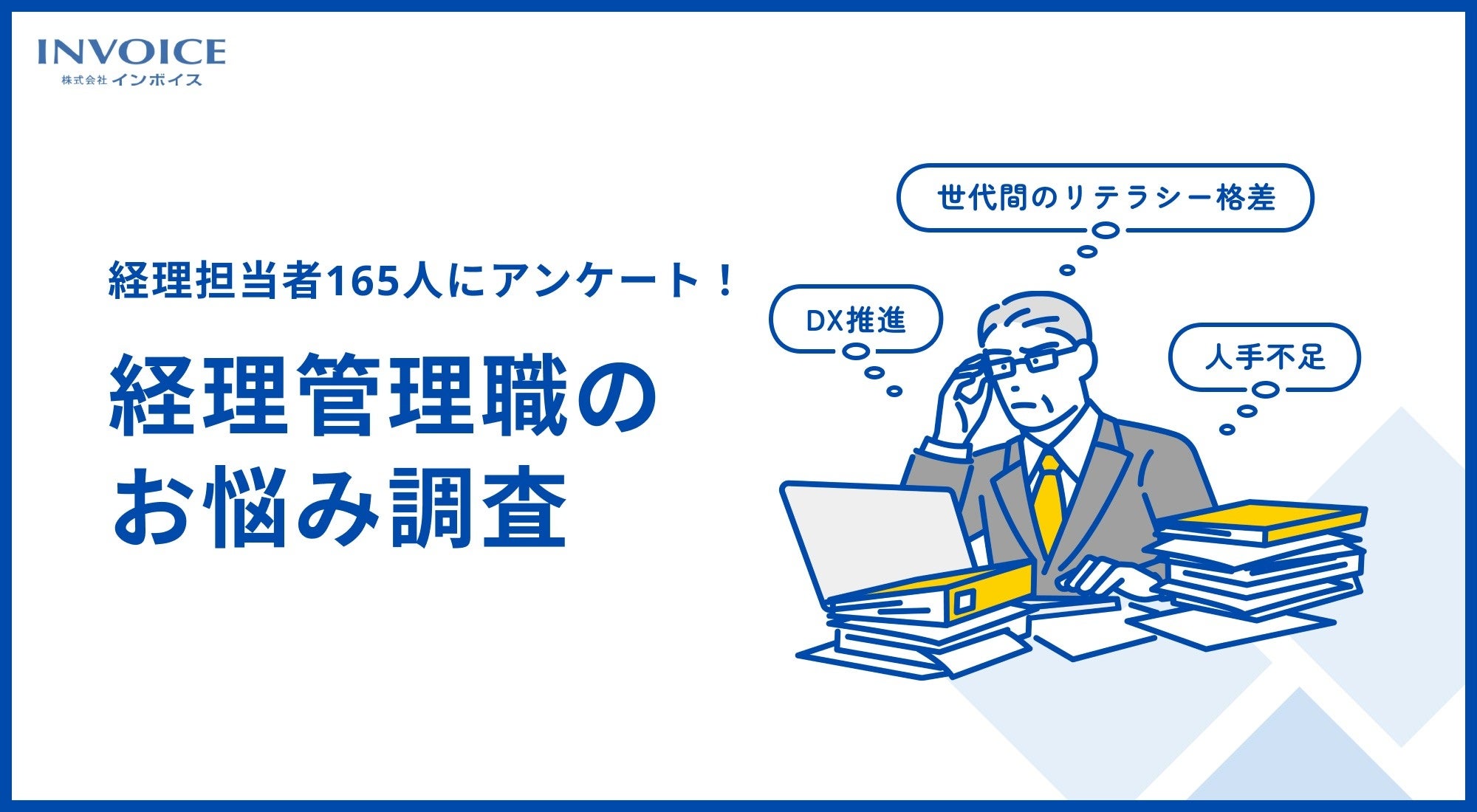通信費や水道光熱費などの一括請求サービス「Gi通信」「OneVoice公共」を提供する、株式会社インボイス(代表取締役社長:仁多見 斎 本社:東京都千代田区)は、企業に所属する経理管理職に対して、現場でどのような悩みや課題が共有されているのかを調査し、自社の状況を客観的に見つめ直し、次の一手を考えるための参考資料として活用可能なレポート「経理担当者165人にアンケート! 経理管理職のお悩み調査」を発表しました。