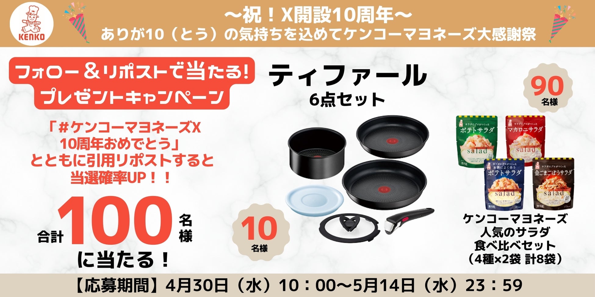【ケンコーマヨネーズ大感謝祭|公式X開設10周年記念】フォロー&リポストで、ティファール製品や人気のサラプロが合計100名様に当たる!