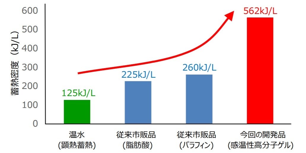 蓄熱温度が30℃~60℃(温度差30℃)における蓄熱材ごとの蓄熱密度を比較したところ、温水で125kJ/L、市販品である脂肪酸で225kJ/L、パラフィンで260kJ/Lであるのに対し、今回開発した感温性高分子ゲルは562kJ/Lと2倍以上の圧倒的な蓄熱密度を有します。